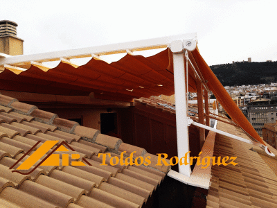 Mediante un reenvío de poleas, extendemos y recogemos el toldo de forma muy fácil y cómoda, también es posible motorizar e incluso automatizar.